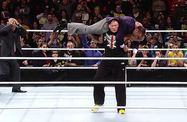 عاد المصارع والوحش البشري بروك ليسنر للظهور مجددا في حلبات WWE لينقذ مدير أعماله الشهير بول هيمان الذي كان على وشك أن يتعرض للطرد من فينس ماكمان.