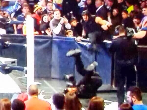 حيث سقط رولينز على الأرض بشكل طريف بعدما حاول القفز عن الحاجز المحيط بطريقته المعتادة، وحاول رولينز تدارك الموقف لكن محاولته باءت بالفشل مما تسبب بإحراجه أمام الجماهير. شاهدوا الفيديو.