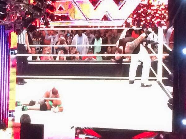 لكن سبق ذلك النزال بقاء تربل اتش وراندي أورتن وباتيستا في الحلبة للإحتفال بضربهم لفريق الدرع ذا شيلد الذين عانوا كثيرا كي يتمكنوا من النهوض بعض كل تلك الضربات القاضية، واحتاجوا الى مساعدة بعض الحكام في البداية قبل العودة إلى غرف الغيار.