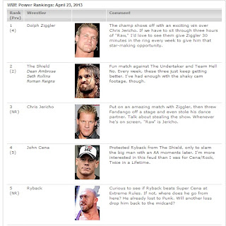 صدر الترتيب الأسبوعي للمصارعين على شبكة ESPN العريقة والتي جاء بطل الوزن الثقيل دولف زيغلر على رأس القائمة متفوقا على ذا شيلد وجيريكو وجون سينا ورايباك.